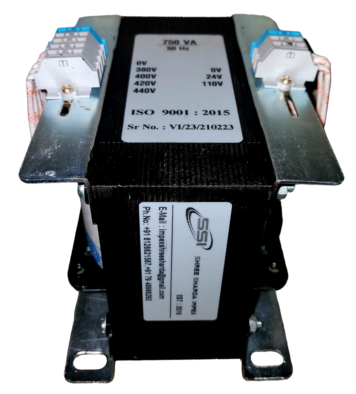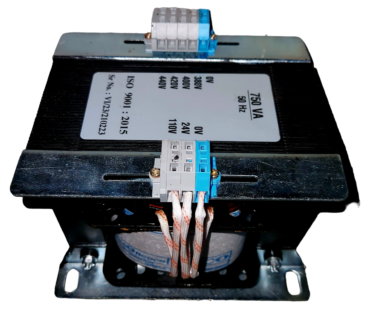 750 VA - 2.Phase - 50/60Hz, 440/24,110V, Copper Wound, Class F insulated, as per IS and IEC.