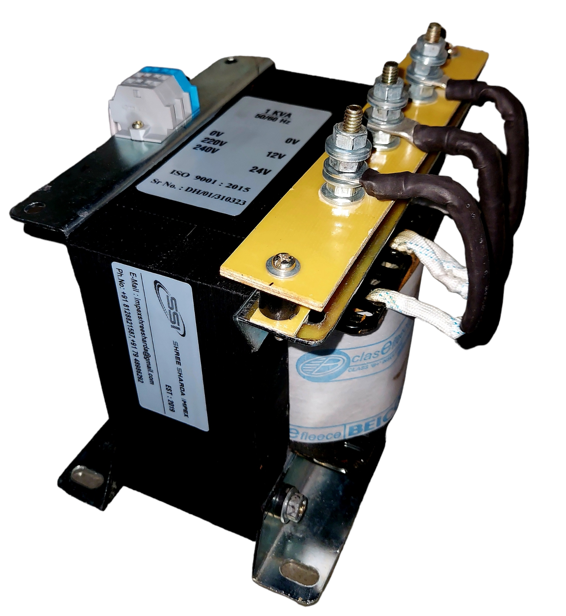 1 KVA - 1.Phase - 50/60Hz, 240/24V, Copper Wound, Class: F insulated, IS 12021, ISO 9001 : 2015 Low voltage, High Amp. Transformer for special Requirement as per demand.